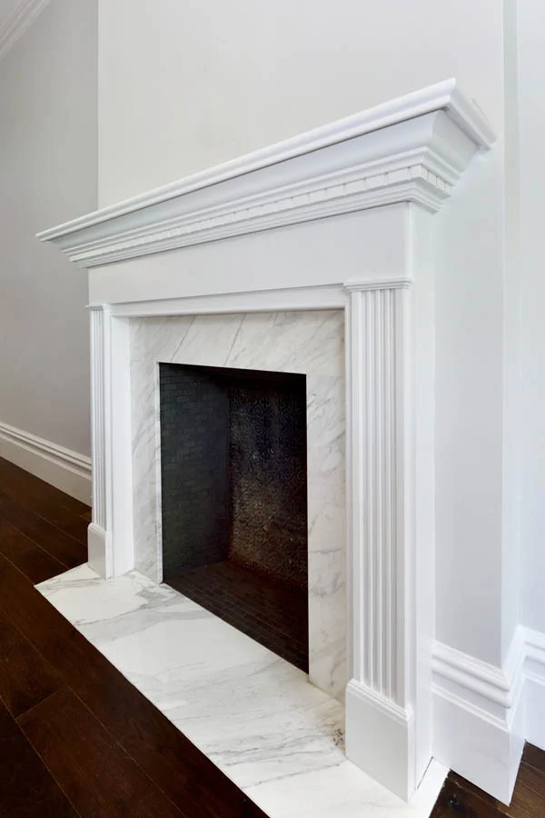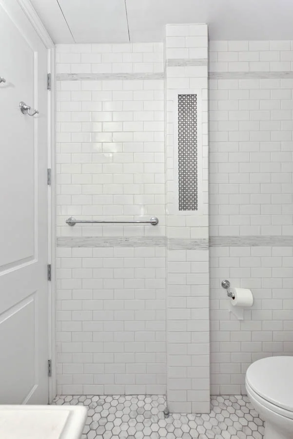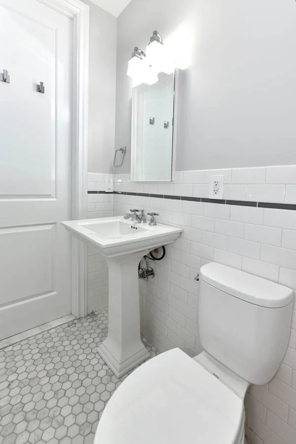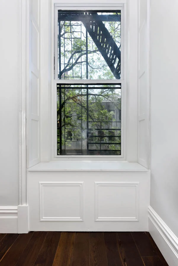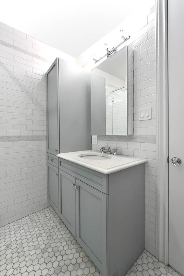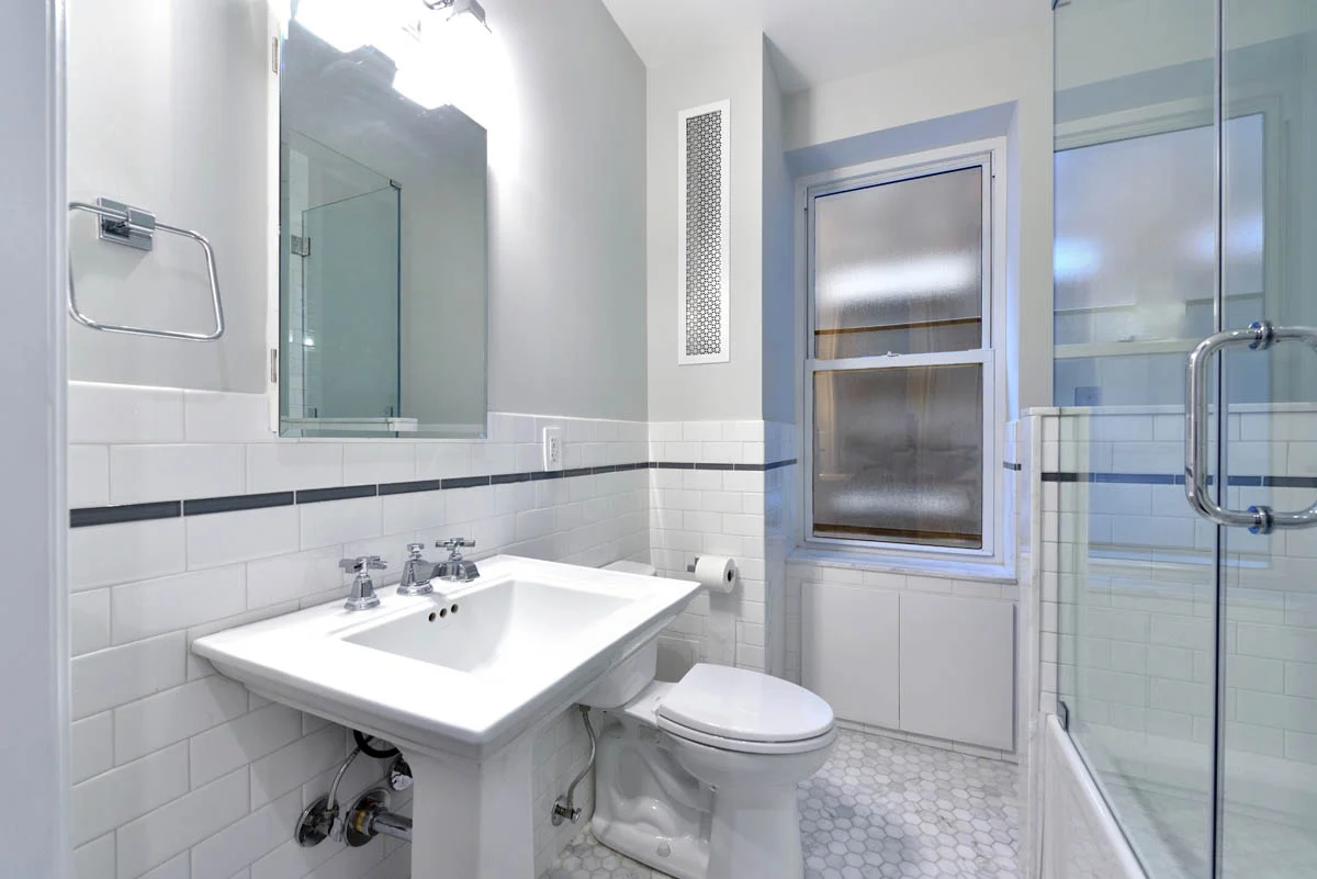This large upper west side apartment has an interesting combination of features contributing to its transitional style. Traditional elements, like moldings, panels, casings, and hearth remain, while a bright white bathroom, modern kitchen, and bold accent colors keep it from feeling stuffy.