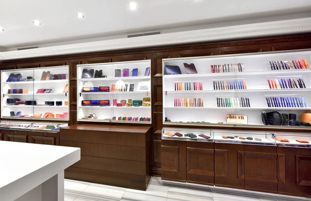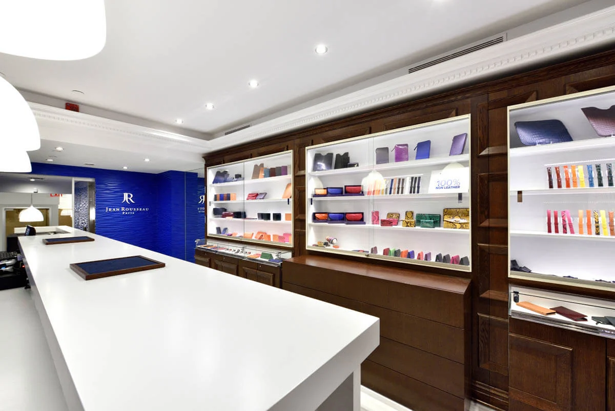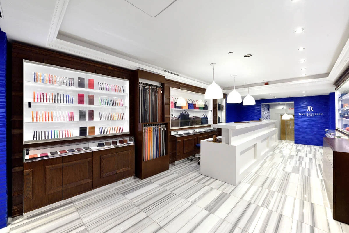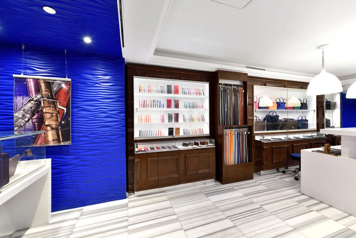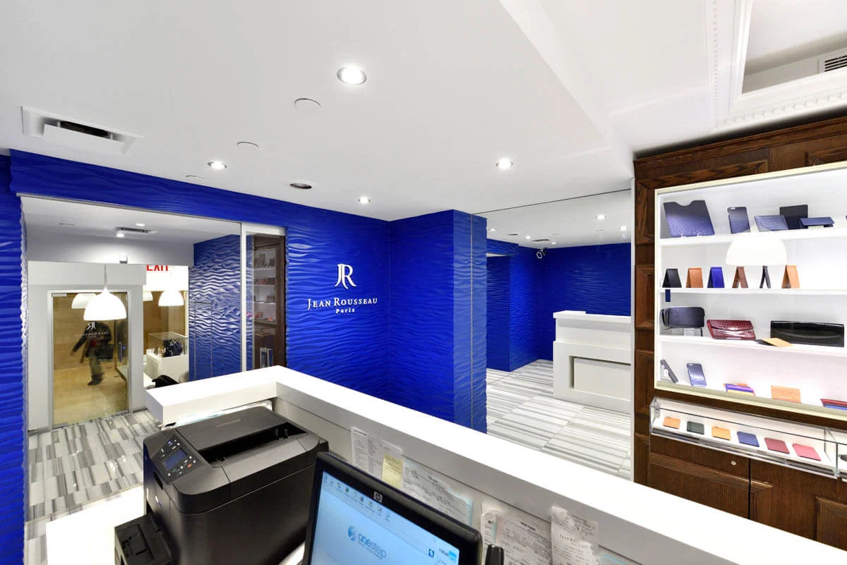 This commercial space was tailored specifically for the client to showcase their line of accessories. Brilliant blues and textured finishes make it a tactile and bold space.
