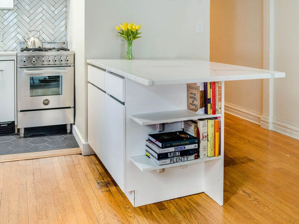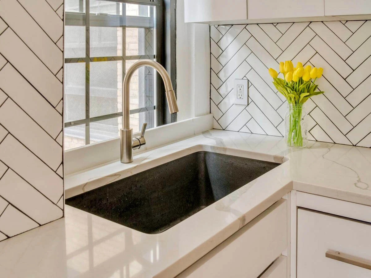 This delightful little kitchen represented a challenge in terms of space saving and clever use. KBR’s designers worked out the best way to niche in everything to maximize the storage capacity of this powerhouse of a tiny kitchen. A hand laid herringbone backsplash brings it all together and adds a touch of luxury.